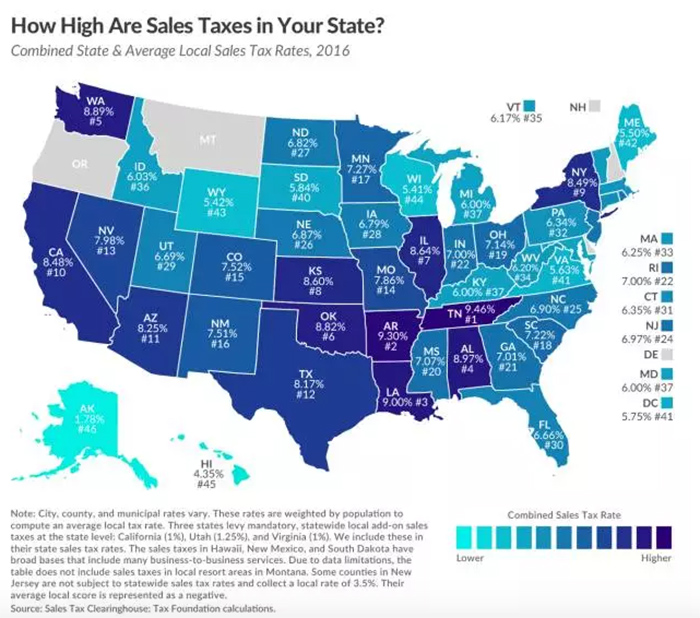 对于企业而言,有各类的设备、机器或是其他动产需要购买,因此,消费税也是企业的一项重要税负。全美各州平均实际消费税率如上图所示,颜色越深代表税率越高,其中有四个州免征消费税,它们分别是:Oregon(俄勒冈州)、Montana(蒙大拿州)、Delaware(特拉华州)及New Hampshire(新罕布什尔州)。