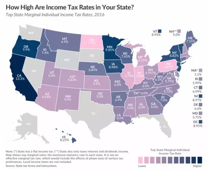 由于合伙企业的所得税是流转至合伙人来征收,许多合伙企业的合伙人都有自然人,并且大部分企业会对员工预扣个人所得税,因此,个人所得税的税负也影响企业资金周转和税负成本。全美有43州征收州个人所得税,其中41个州对工资等各收入征税,而New Hampshire(新罕布什尔州)和Tennessee(田纳西州)仅针对利息和红利征税。依上图所示,颜色越深代表最高税率越高。同时,有7个灰色州免征州个人所得税。