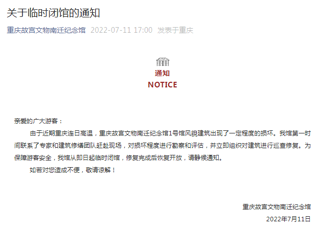 为保障游客安全,重庆故宫文物南迁纪念馆从即日起临时闭馆,修复完成后恢复开放,请静候通知。