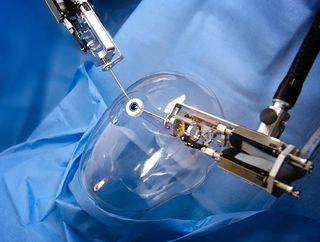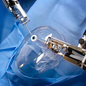 全球首例在眼睛手术中使用机器人在2016年。在相机反馈的辅助下,医生利用操纵杆控制眼球切口中的微型视网膜手术机器人R2D2,将起皱的视网膜(厚度仅有10微米)铺平,修复了病人的视力。