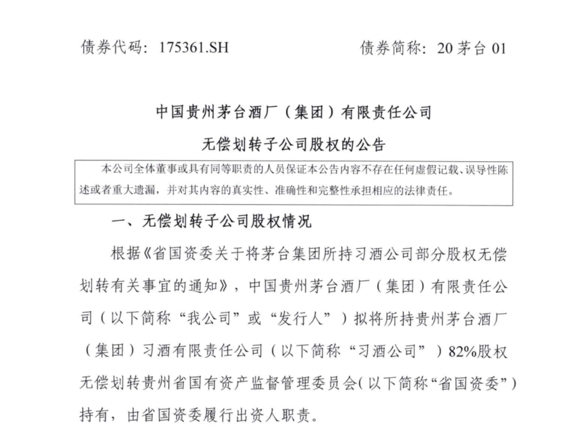 7月12日,中国贵州茅台酒厂集团有限责任公司公告显示,根据《省国资委关于将茅合集团所持习酒公司部分股权无偿划转有关事宜的通知》,中国贵州茅台酒厂(集团)有限责任公司拟将所持贵州茅合酒厂(集团)习酒有限责任公司82%股权无偿划转贵州省国有资产监督管理委员会持有,由省国资委履行出资人职责。