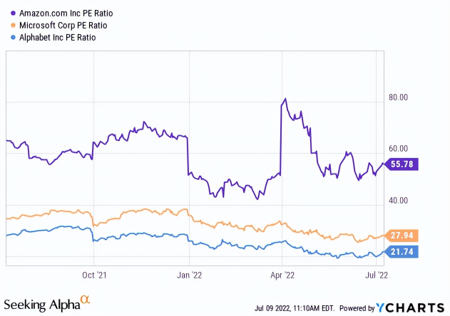 亚马逊的低营业利润率给他们带来了极高的56倍市盈率,这比以28倍市盈率交易的微软要贵。