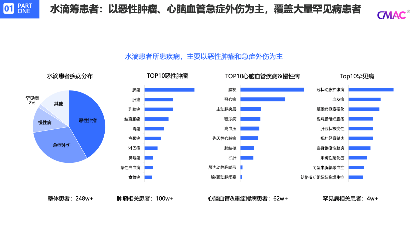 “水滴服务的患者几乎遍布全中国每家医院,这使水滴积累起包括疾病类型、医疗费用、鉴别诊断、临床表现、药物治疗等在内的庞大医疗知识图谱,是极具价值的数据样本。”梁玉芹谈到。截至目前,有近250万大病患者通过水滴筹发起筹款,累计筹得医疗资金约509亿元。筹款患者中,男性占比61.2%,年龄在45岁以上的占比超6成,遍布全国340+城市和10000+医院,84.5%在三线及以下城市。筹款患者以恶性肿瘤、心脑血管急症外伤为主,并覆盖大量罕见病患者。