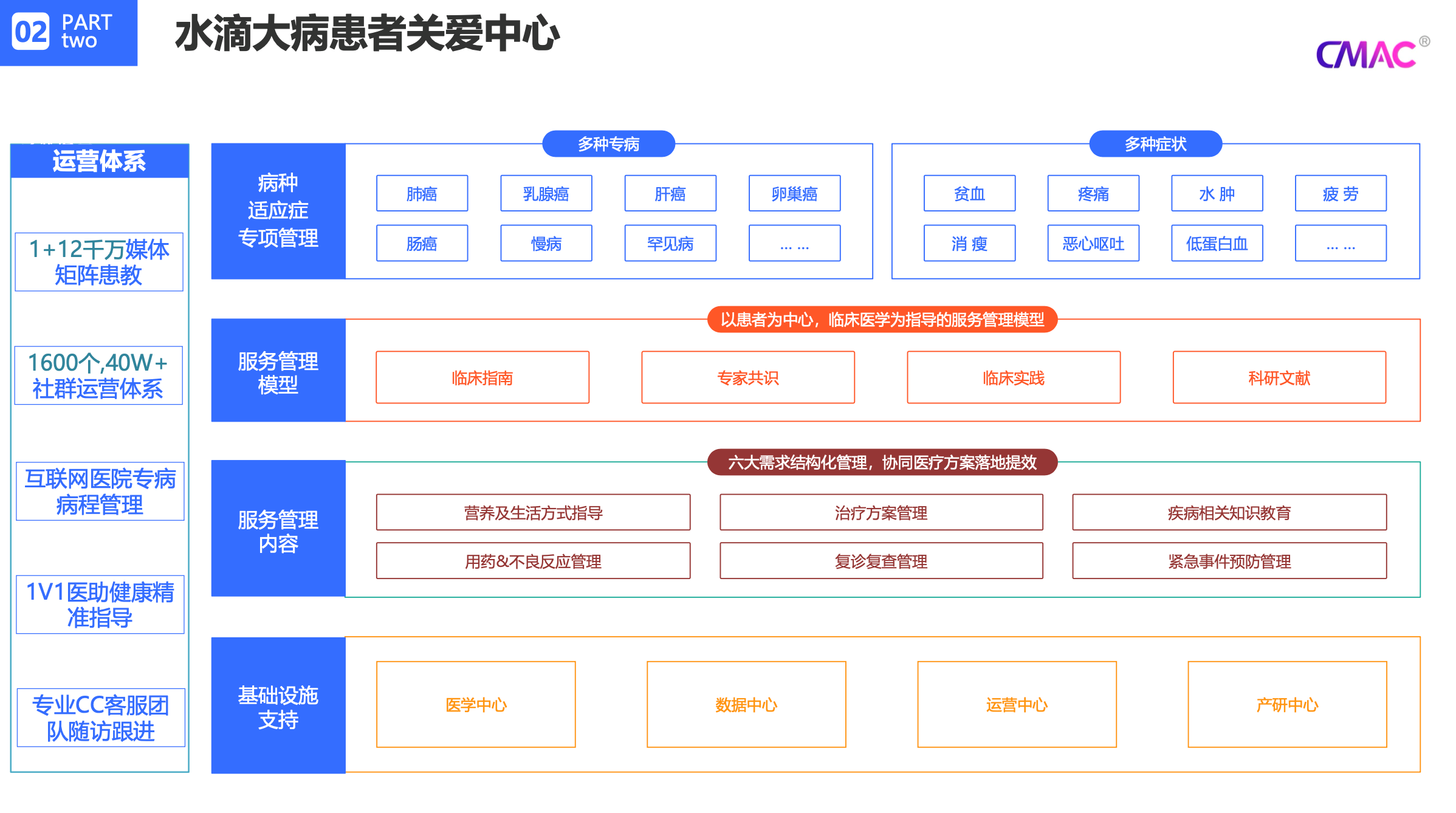 为更好的服务患者,水滴搭建患者服务平台“水滴大病患者关爱中心”,已累计服务患者超过250万,能够为患者提供全周期的健康管理和支付服务。提供有温度的1V1专业服务,并建立内容、社群、随访等多渠道全病程触达,个性化满足患者不同需求,可分病种、分阶段根据患者需求提供针对行的服务。