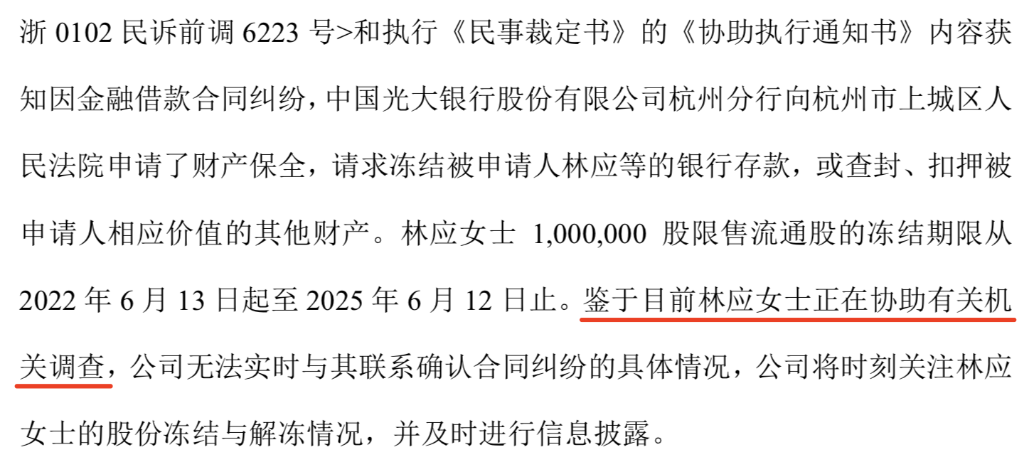 到7月6日,泽达易盛公告,因金融借款合同纠纷,中国光大银行股份有限公司杭州分行向杭州市上城区人民法院申请了财产保全,作为泽达易盛实际控制人的林应已经于7月1日被冻结限售流通股份1,000,000股。此时泽达易盛也表示,林应还在接受调查中。