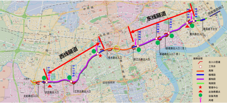 正在建设中的上海北横通道新建工程西起中环北虹路立交,东至周家嘴路内江路交叉口,全长19.1公里,为上海市中心城区北部东西向小客车专用通道,是服务虹桥枢纽、北部重点地区、浦东新区高效的中心城区骨干路网的重要组成。沿线涉及长宁、普陀、静安、黄浦、虹口、杨浦共6个行政区、20个街镇、64条道路、11条轨道交通,5次穿越苏州河。