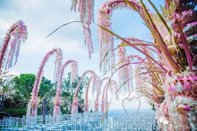 一个男神,一个女神,他们的婚礼现场也浪漫中带着仙气,满足了无数少女对婚礼的幻想:在巴厘岛的海边,当地特有的祈福植物,新娘最喜欢的粉色花朵迎着海风飘扬;漂亮的心形花门,透明的地板,还有满座的亲朋好友……一切都幸福美满。