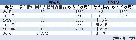 根据网络数据,两人都入过福布斯中国名人榜,收入上旗鼓相当,互有超越。