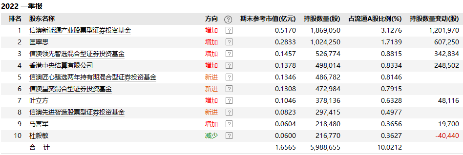 今年一季度末,“信澳系”上榜股东增至五只基金。原有两只继续大幅加仓,十大流通股东名单中还新增了信澳匠心臻选两年持有期混合型基金、信澳星奕混合型基金和信号先进智造股票型基金,占据了第一、三、五、六、八大股东之位。五基金合计持股365.31万股,基金经理均为冯明远。