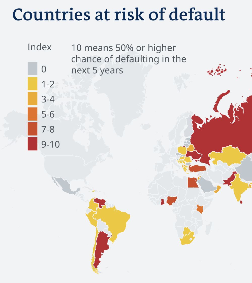 根据金融服务公司Tellimer的研究,已经有22个国际的美元计价主权债券收益率超过10%,委内瑞拉、黎巴嫩、苏里南、赞比亚等国均榜上有名,数量比去年年底翻了一倍。彭博社的数据显示,目前有涵盖9亿人口的19个国家主权债务属于不良债券水平,存在违约风险的债券总额高达2370亿美元。