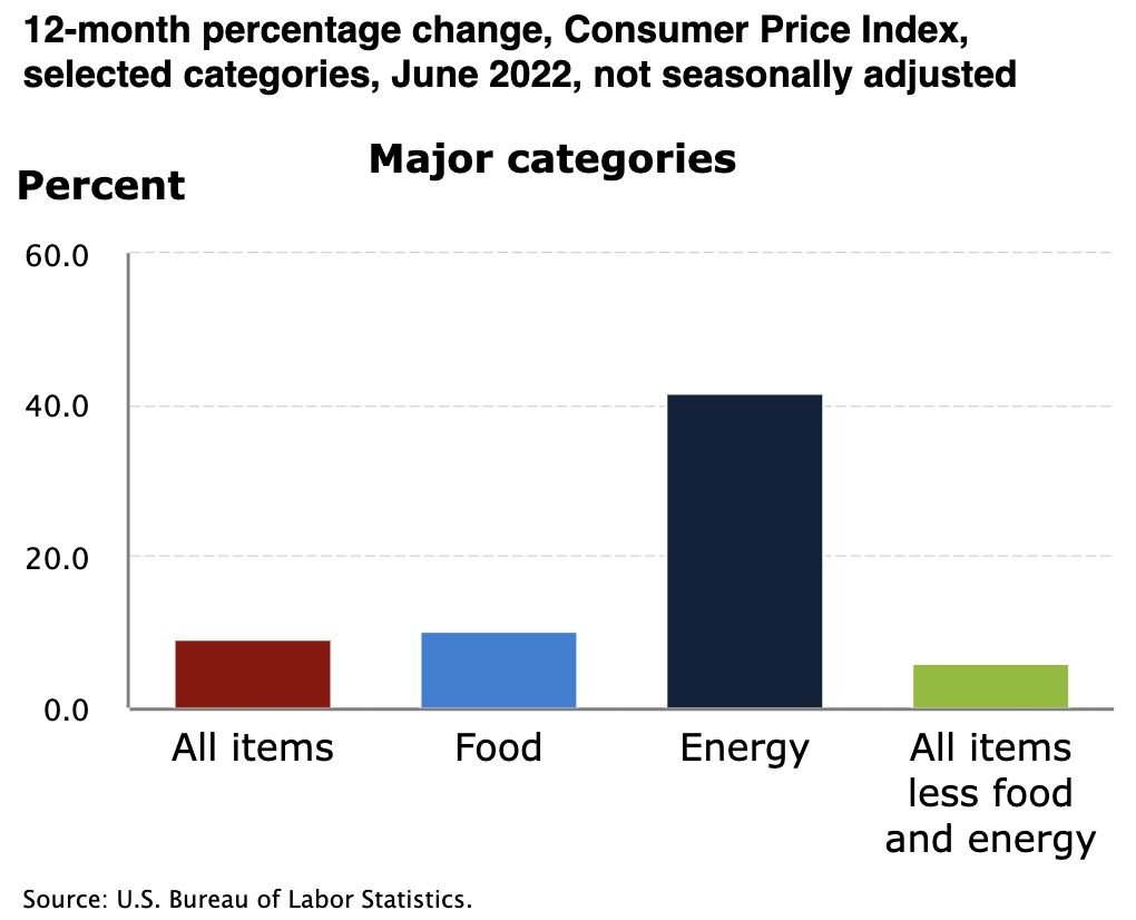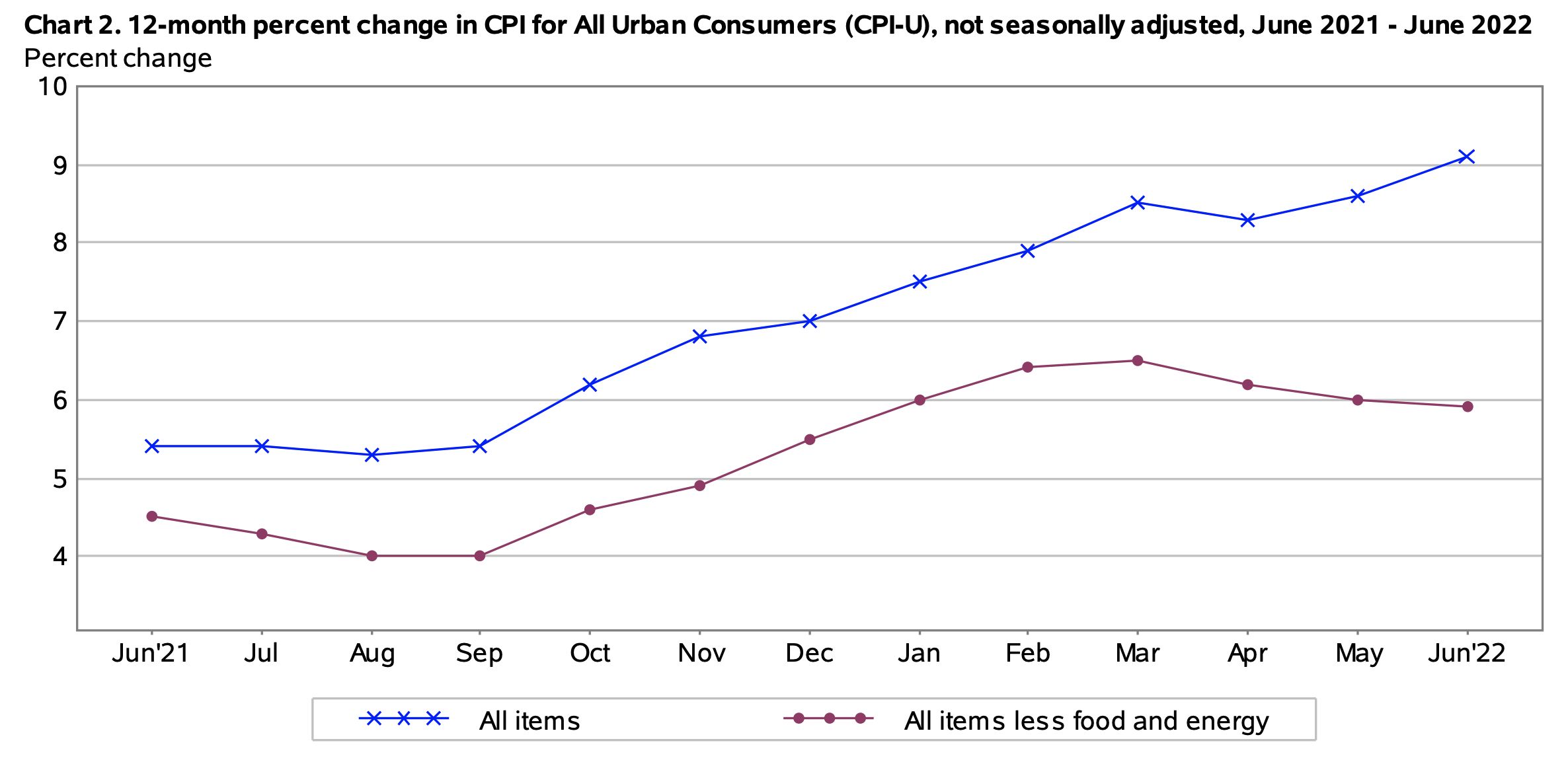 7月13日,美国劳工部公布的数据显示,美国6月消费者价格指数同比增长9.1%,高于5月的8.6%,也高于市场此前预期的8.8%,再次刷新了1981年以来的纪录。
