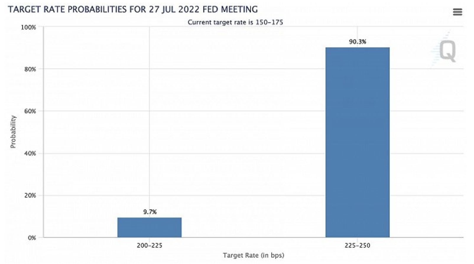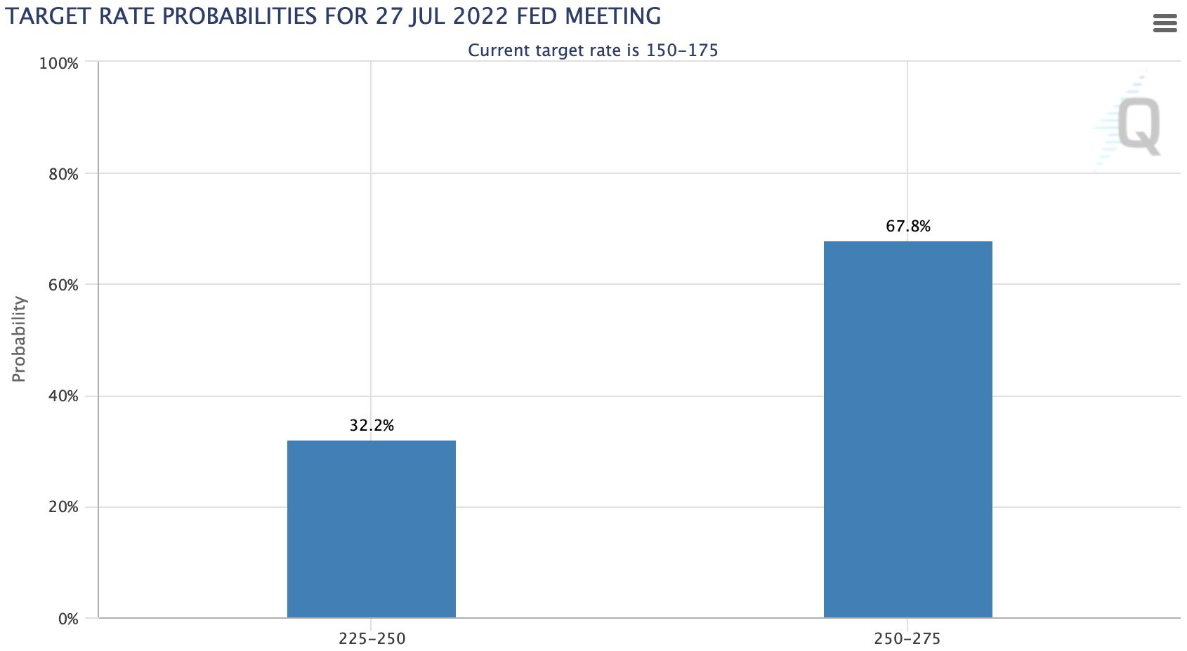 芝加哥商品交易所的利率观察工具FedWatch数据显示,7月7日时超过90%的投资者押注美联储将加息75个基点。在6月通胀数据公布之后的7月13日,仅有32%的投资者继续押注75个基点的加息幅度,近68%的投资者认为美联储将选择更加激进的100个基点加息幅度,并将联邦基金利率区间提升至2.5%-2.75%。