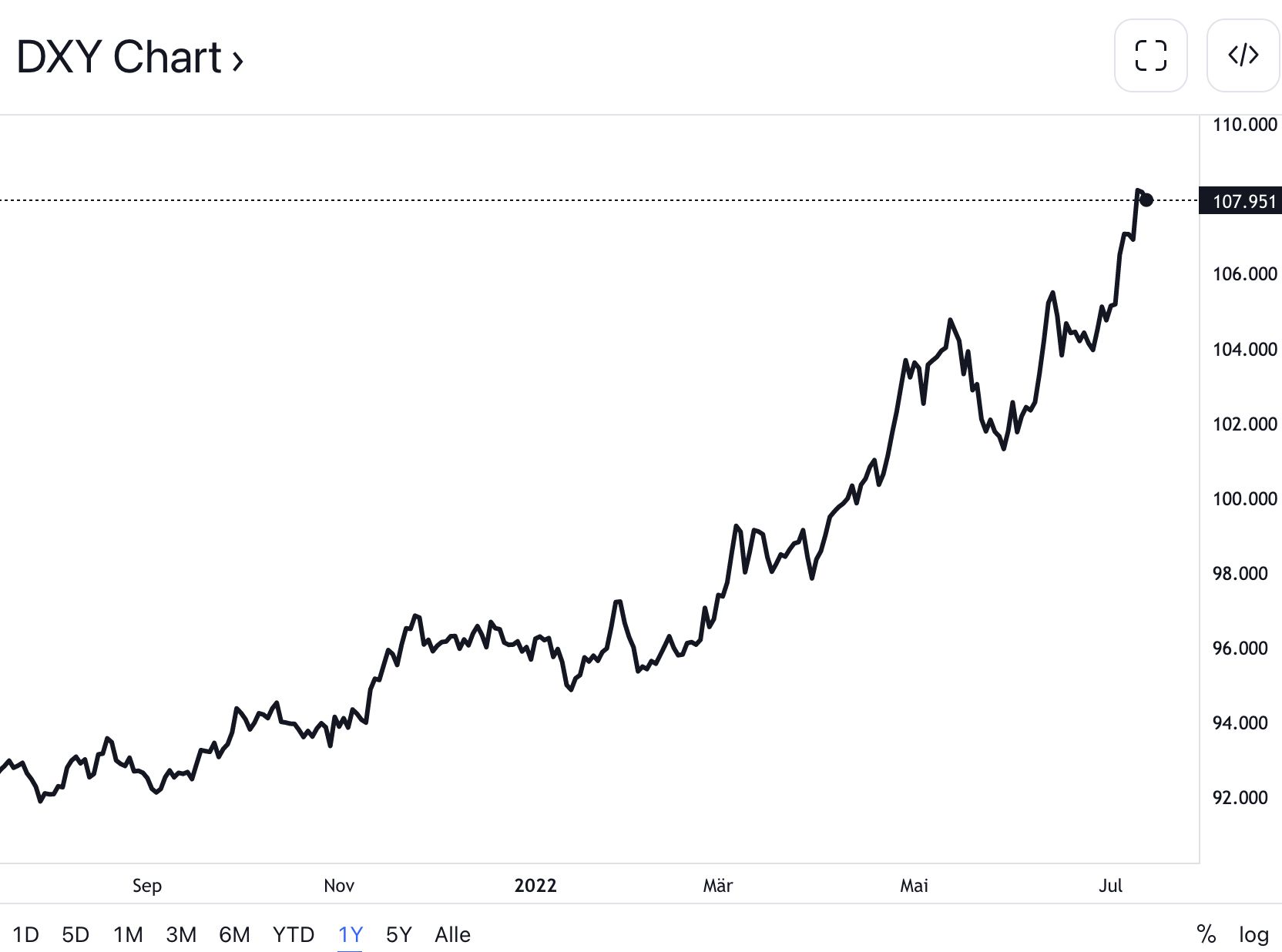 美元指数目前已经攀升至108,达到20年来高点。美元指数主要参考美元兑其他六种世界主要货币的综合汇率,其中权重达到六成的欧元已经于7月12日与美元达到平价。