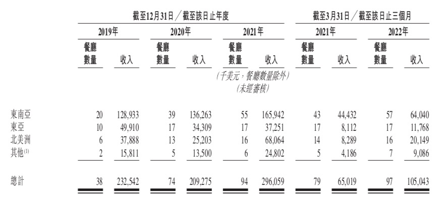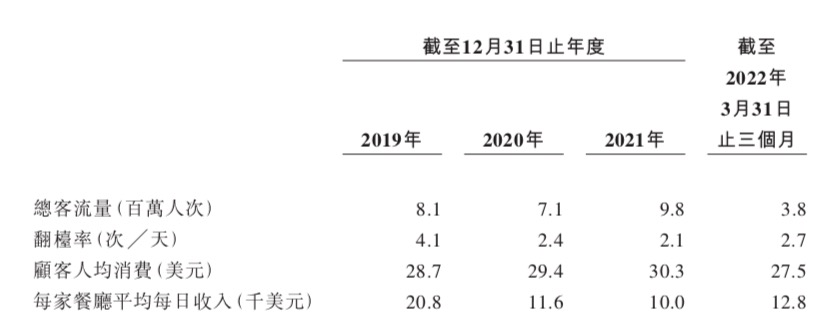 在2019年,餐厅共录得约810万人次的客流量;2020年疫情高峰时期客流量为约710万人次,2021年这一数字是约980万人次。2022年一季度,随着部分国家疫情逐步缓解,共录得约380万的顾客人次,较2021年同期的约240万人次增长60.3%。
