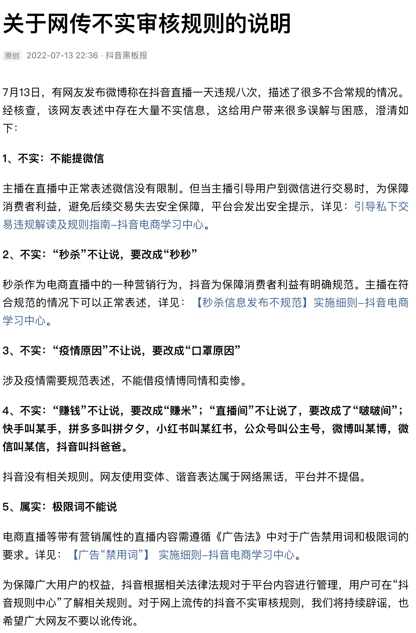 抖音发布关于网传不实审核规则的说明称,7月13日,有网友发布微博称在抖音直播一天违规八次,描述了很多不合常规的情况。经核查,该网友表述中存在大量不实信息。主播在直播中正常表述微信没有限制。但当主播引导用户到微信进行交易时,为保障消费者利益,避免后续交易失去安全保障,平台会发出安全提示。