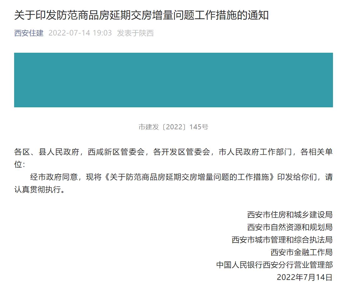 7月14日晚,界面楼市西安频道从西安住建局官方微信公号“西安住建”获悉,为进一步规范房地产市场秩序,有效防范商品房延期交房增量问题,促进房地产市场健康有序发展,西安市住房和城乡建设局、西安市自然资源和规划局、西安市城市管理和综合执法局、西安市金融工作局、中国人民银行西安分行营业管理部联合印发《关于印发防范商品房延期交房增量问题工作措施的通知》(下称“工作措施”)。