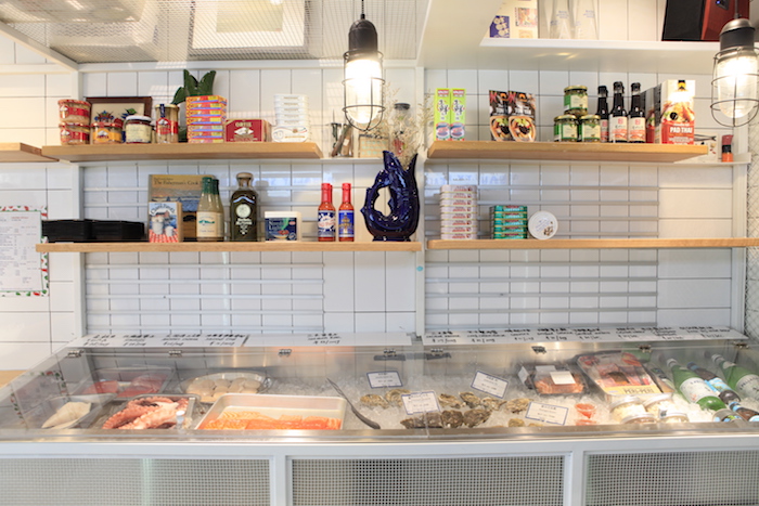 Little Catch的店铺面积只有不到20平米,装修简单、结构紧凑。除了入口处落地玻璃窗前摆着的桌椅以及空间底端兼具厨房和收银区功能的半开放式工作间内的几张桌子,整个店铺最主要的家具或者说装饰物就是临着白瓷砖墙而放的一排冰箱和冷柜——Little Catch销售的都是需要冷藏或是冷冻保存的进口海鲜,因此无需使用传统水产销售场所常见的水盆、冰池等器具设备。这使得整个空间干净、整洁、没有腥味。而当落地窗里投进阳光,配合店里的日光灯光,整个空间更是显得明亮、现代。