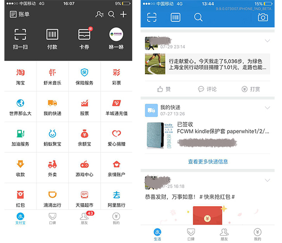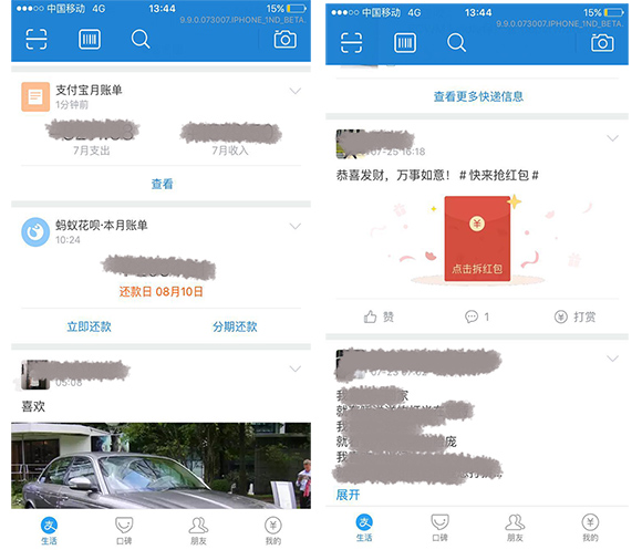 新版最主要的一个理念是,“从原先的人去找服务,变成服务来找你”。放在首屏的不仅仅是有原先生活圈的内容,还包括水电煤账单、快递信息、信用卡账单、花呗账单等,原先漏掉的账单信息都将准时出现在你的信息流里。