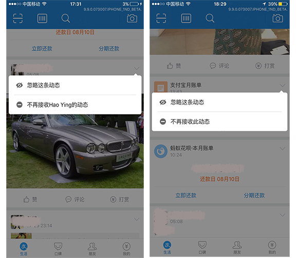 可以预想到,信息流推送带来的一个问题是,容易有一些乱七八糟的广告混进来,具体可以参见现在的微博乱象。当支付宝有更多的商业诱惑时,它必须更加清醒——确保用户点击不关注此类消息时,就真的不再骚扰用户了。