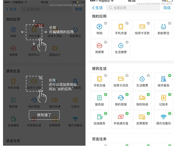 最顶部的8个功能模块是可以通过自定义设置的,新版默认的顶栏7项是支付宝选出的用户使用频率最高的功能。如果想更改默认设置可以通过拖拽操作完成。