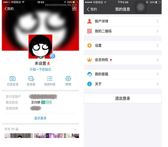 改动比较大的是最后一栏“我的”中“个人主页”设置,相比于9.6版本而言,新版支付宝更强调这款App中的个人属性,在每个人自己的标签页中显示有你的实名认证信息,可以申请查看芝麻信用。可以在个人页面向对方转账、发消息,查看他的最新动态。