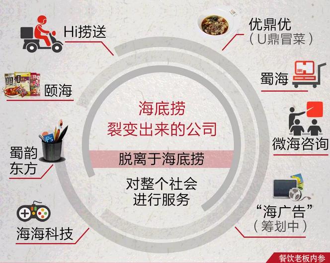 这就像一个家庭,通过不断地分家,最终形成一个大家族。海底捞的拆分,除了形成一个“大家族”外,还形成业务模式上的协同。