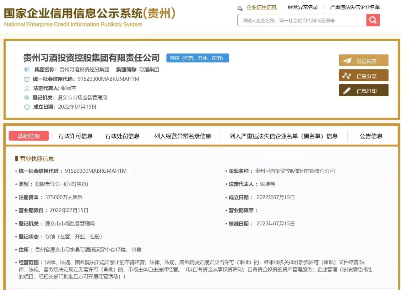 7月18日,界面新闻从国家企业信用信息公示系统获悉,贵州习酒投资控股集团有限责任公司(以下简称“习酒集团”)已于7月15日成立组建。