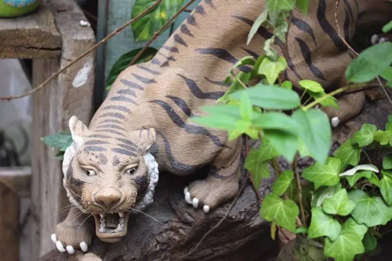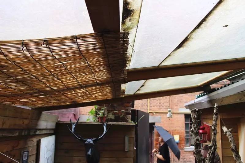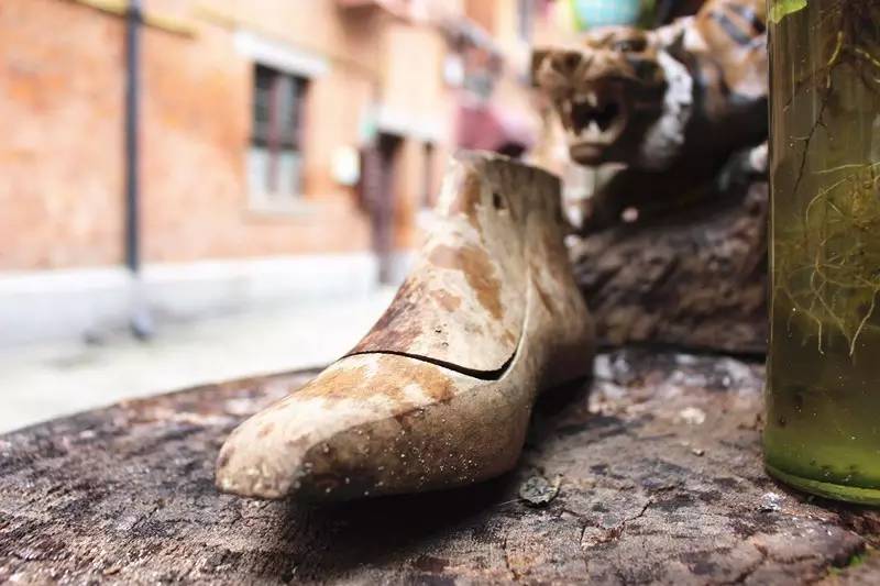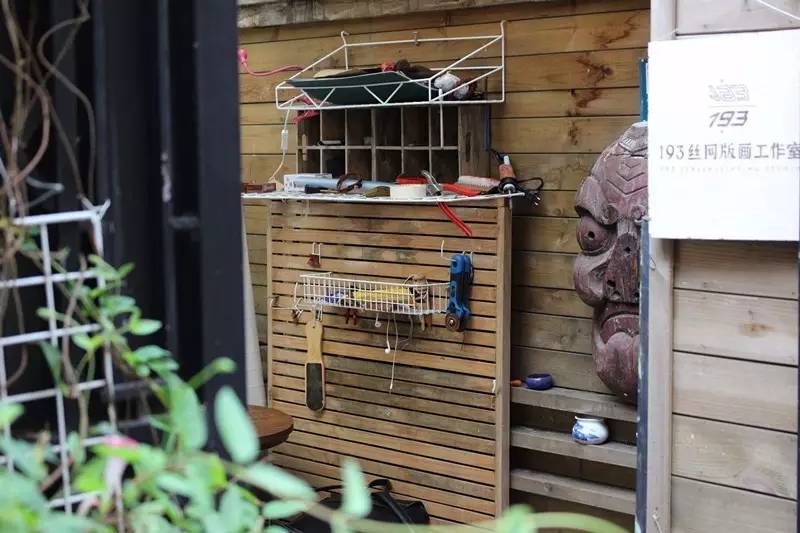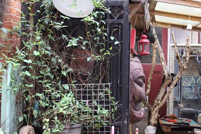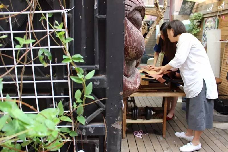 进入庭院就是皮具制作区,虽然只是原木、雨棚搭起的方寸空间,但在各种摆件墙饰的烘托下,这种原始的粗糙感反倒让整个空间有种搬离城市喧嚣的静谧感。