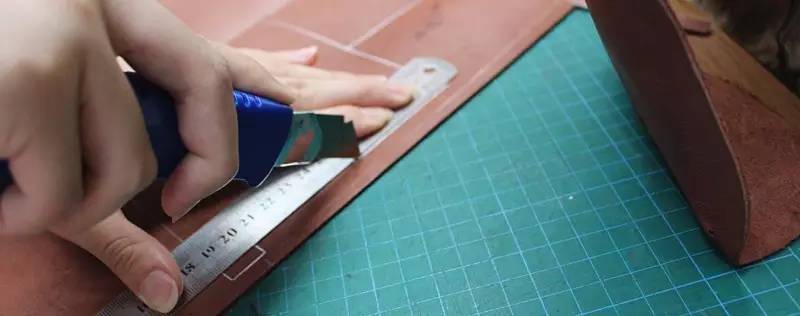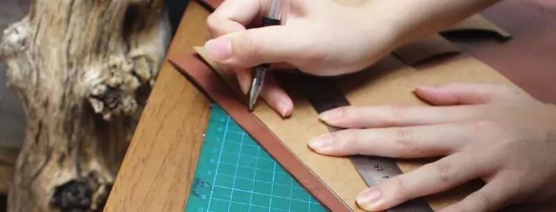 把模版纸压在皮料上,用笔画出皮具的雏型线条,然后把尺子压在线条边缘,用美工刀对皮料进行切割。老师告诉我们,在这个步骤有个小诀窍,就是道口紧贴尺子边缘,美工刀与皮料呈90度切割。切割时尽量不要看刀口,凭感觉用力割。