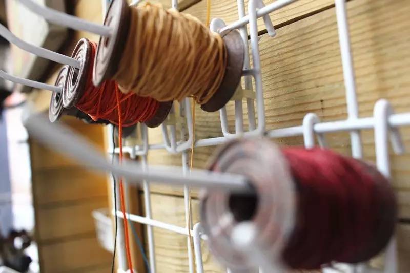 皮料、线筒、工具,色彩充满整个空间,它们既是实用的材料,也是最好的装饰品。它们被随意挂放于墙上、门边、木台上,看似杂乱无章,但每个区域都分工有术, 这是匠人们最舒适的收纳方式,随手取,即时做。