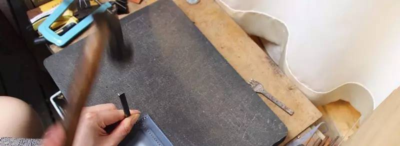 接下来就到了在皮料上打孔的环节,这样才能让缝制过程更加顺利。在缝制时使用的是双针对缝的方式,一根线两根针交叉缝制,这样缝制出来的效果会更加平整、结实。