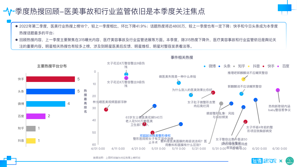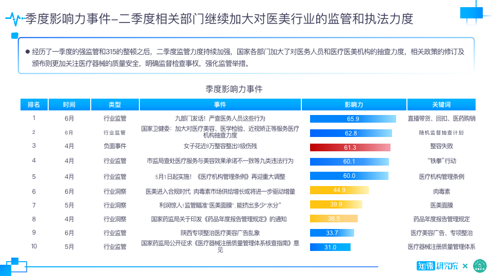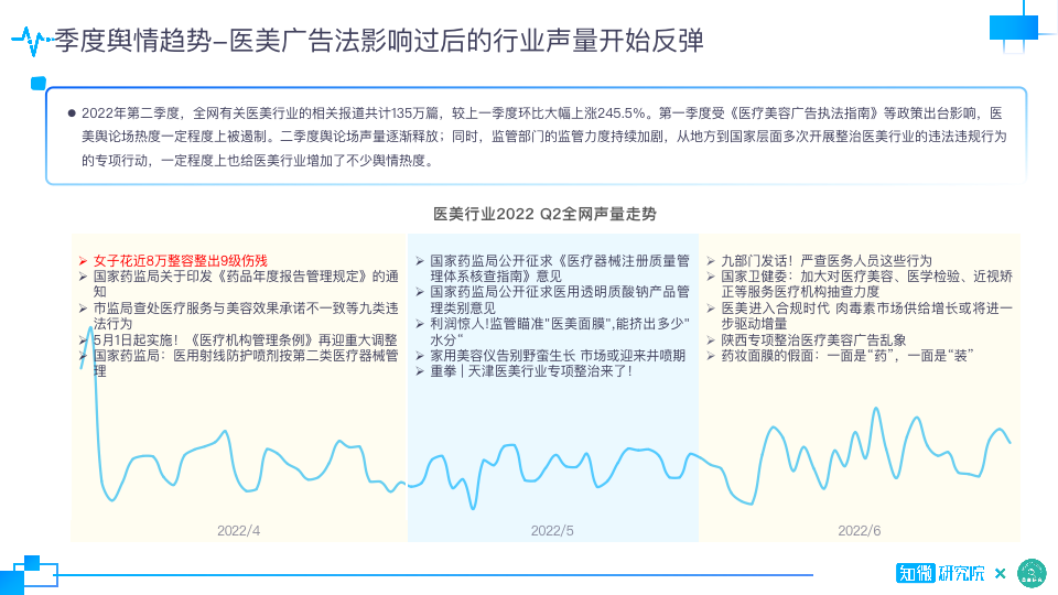 可是,黑医美隐蔽性高、离散性强、基本上没有建立品牌,所以媒体报道黑医美的隐性成本是高的。而在红头文件指导下,在法院判决和热搜的加持下,医美事故和行业监管依旧是本季度舆论关注的焦点。