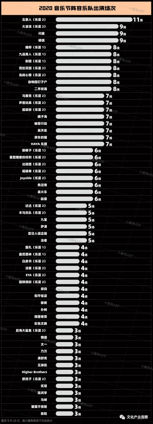 在《乐队的夏天》、《明日之子:乐队季》等乐队音综,《说唱新世代》、《说唱听我的》等嘻哈音综爆红后,选手们大量涌入音乐节,贡献了音乐节的抢手舞台。这些综艺的年轻粉丝们也随之将目光投向了音乐节,向其注入了新鲜消费力。据小鹿角智库,2020年,来自《乐队的夏天2》的五条人乐队参与音乐节次数高达11场。第一梯队的歌手参加音乐节报价约在百万元以上,第二梯队的摇滚歌手与乐队报价约为60-80万元。参与过音综的乐队报价相对其它乐队来说较高,音乐节邀请音综选手作为嘉宾,虽然有蹭热度之嫌,但仍然是最具“性价比”的选择。