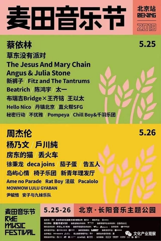 2019年北京麦田音乐节有草东没有派对、新裤子、告五人等热门乐队,更有周杰伦、蔡依林助阵,而预售门票仅350元。据物联中国,演唱会的最高档票价一般在1200元以上,根据不同明星和场馆,也可能高达1600元以上,相当于三至四场的音乐节价格。