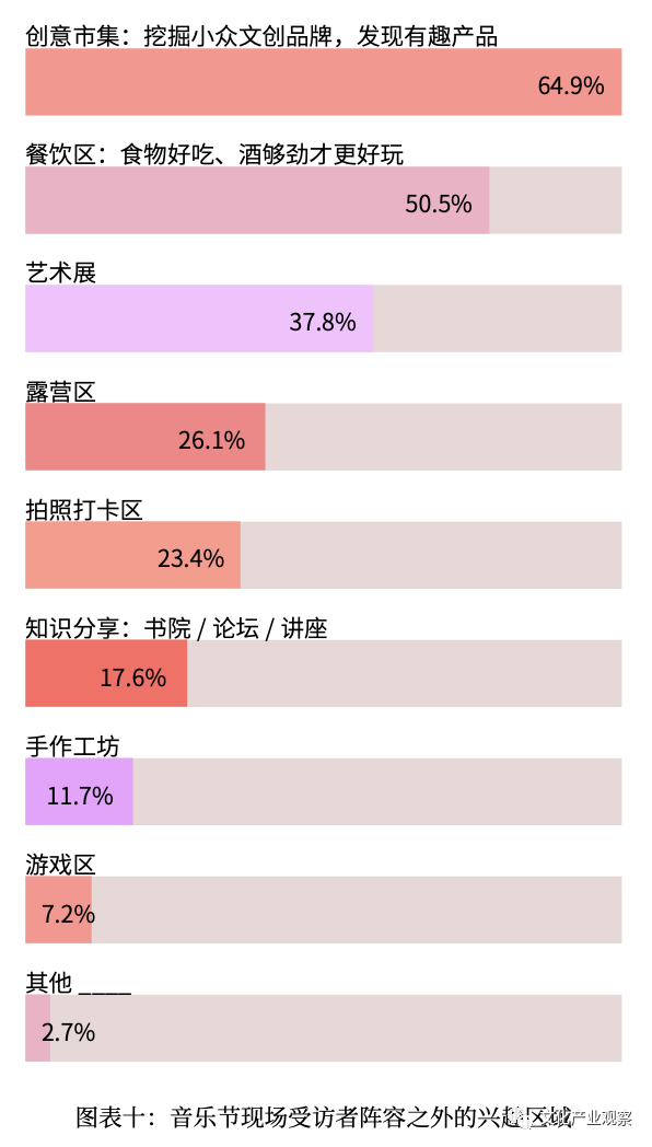 此外,除舞台外,消费者也对音乐节的附属娱乐活动青睐有加,例如创意集市、餐饮区、艺术展等。在如此氛围下,乐迷们更享受与朋友一起参加音乐节的经历。对于年轻人们来说,音乐节更像是一种社交活动,欣赏音乐舞台后的其它活动一样必不可少。音乐节结合其它多元业态共同满足了年轻人们对一次出行所具备的社交属性、多元文化、趣味艺术的渴求。