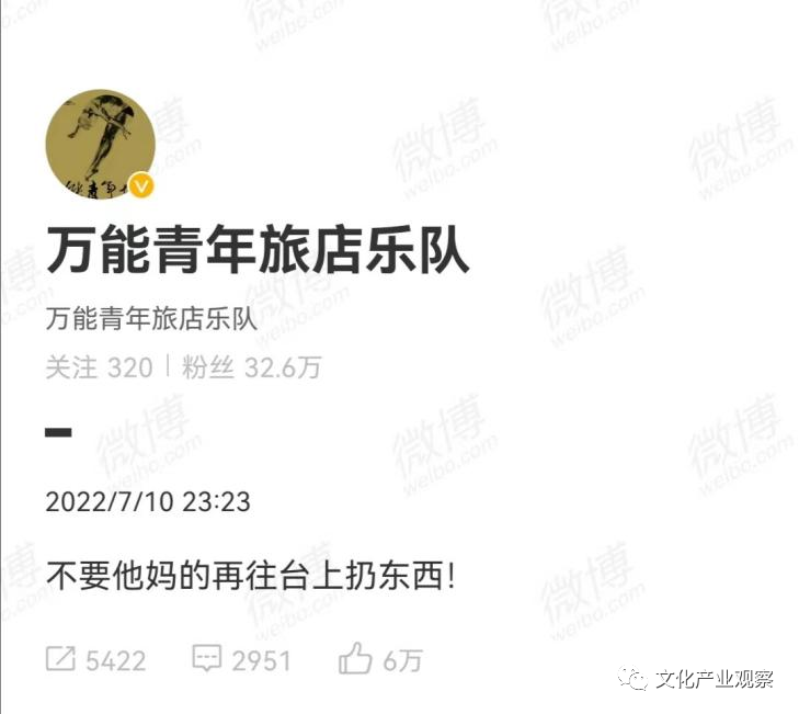10日,万能青年旅店乐队在音乐节取消后登上热搜,斥责观众向舞台投掷物品的行为。无独有偶,脏手指乐队主唱被观众扔的烟所砸中脸部的视频也引起热议。还有许多乐队也加入声讨这种不良行为。即使乐迷强烈希望与音乐人进行“互动”,但这种危险行为不仅会对乐手造成伤害,还破坏了音乐节应有的轻松氛围。