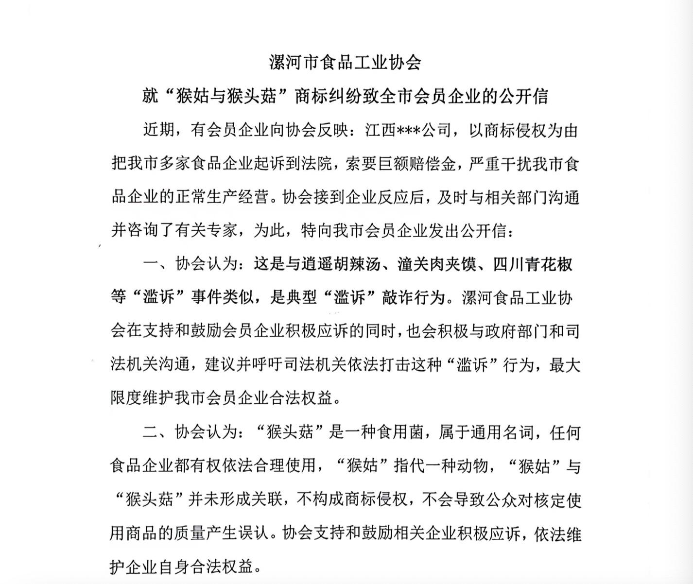 公开信显示称:“江中食疗以商标侵权为由把漯河市多家食品企业起诉到法院,索要巨额赔偿金,严重干扰漯河市食品企业的正常生产经营。”上述协会认为,“猴头菇”是一种食用菌,属于通用名词,任何食品企业都有权依法合理使用,“猴姑”指代一种动物,“猴姑”与“猴头菇”并未形成关联,不构成商标侵权,不会导致公众对核定使用商品的质量产生误认。