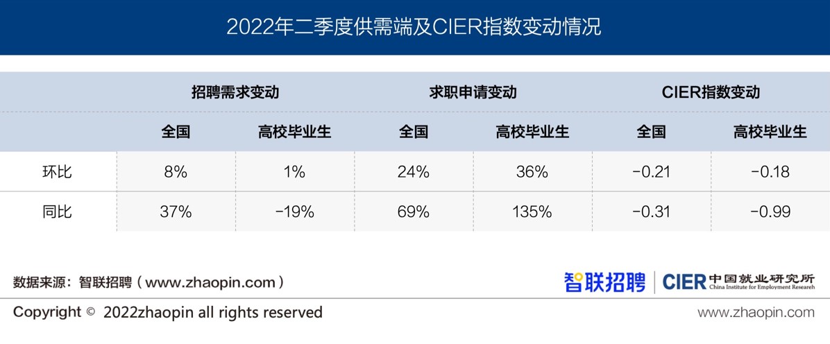 从环比来看,二季度,企业招聘高校毕业生人数上升1%,求职申请人数上升36%;从同比来看,企业招聘需求人数下降19%,求职申请人数上升135%。