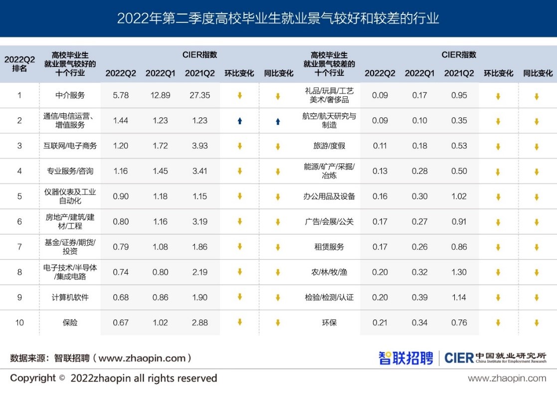 7月20日,人民大学就业研究所与智联招聘联合发布的2022年二季度高校毕业生就业市场景气指数仅录得0.53,连续第四个季度下降,不仅比2021年同期低0.99,也比2020年同期低0.79。