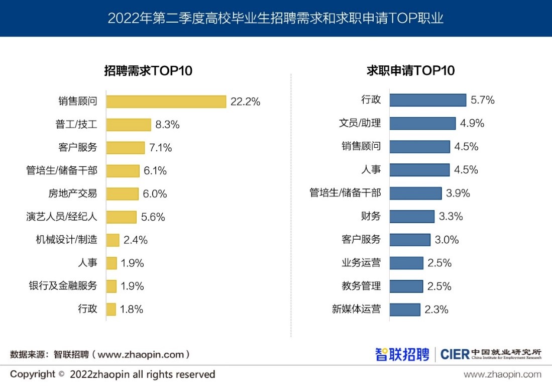从职业来看,招聘需求最多的职业为销售顾问、普工/技工、客户服务、管培生/储备干部、房地产交易等;而求职人数最多的职业为行政、文员/助理、销售顾问、人事、管培生/储备干部等。
