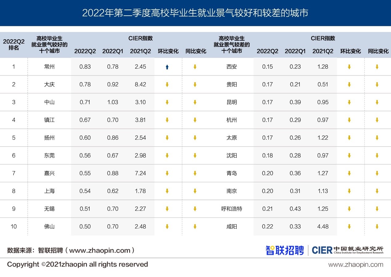 从城市来看,即便表现最好的城市,高校毕业生就业指数也小于1,也就是招聘需求小于求职人数。二季度,大学生就业表现最好的是常州,但就业指数也仅录得0.83,排名第二的大庆,则从上年同期的8.42降至今年二季度的0.78。