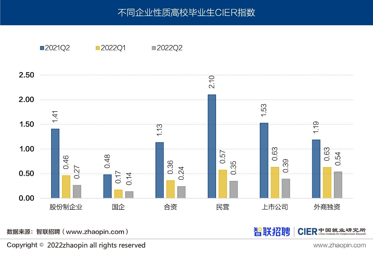 从企业性质来看,外商独资企业景气度最高,为0.54,上市公司次之,为0.39,民营企业为0.35。国企就业指数最低,仅为0.14。与上年同期相比,国有企业招聘需求人数增长4%,但求职人数增长更多;与一季度相比,国企招聘需求降幅最多,为13%,但求职供给上升了10%。