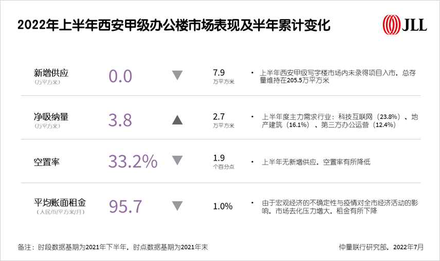 7月21日,仲量联行发布《2022年上半年西安商业及物流地产市场报告》。界面楼市西安频道从仲量联行获悉,上半年受疫情反复影响,️甲级办公楼市场,未录得新项目入市,科技互联网产业主导增量需求,净吸纳量同比回落35.6%,租金持续下滑。