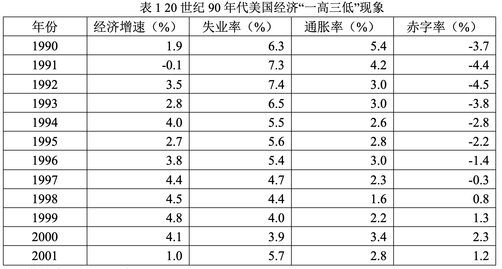 居高不下的财政赤字一直是困扰美国经济发展的一大顽症。1992年布什政府时期,联邦赤字竟高达2930亿美元,创历史最高纪录。为了使美国经济尽快摆脱困境,克林顿上台后于1993年2月提出振兴经济计划,其核心内容之一是大幅度减少财政赤字。克林顿签署的削减赤字法案规定,自法案生效的5年内削减赤字4960亿美元,其中增税2410亿美元,减支2550亿美元。增税的范围主要是个人所得税和公司所得税。缩减财政支出主要有以下两个方面:一是精简政府机构,压缩行政费用;二是大力削减军费开支,把布什执政时期约3000亿美元的军费总额砍掉500亿美元(崔维,1999)。因冷战已经结束,美国放弃了耗资巨大的“星球大战计划”。削减赤字的政策收到了良好效果,赤字率从1992年的4.7%大幅下降至1997年的0.3%,到1998年美国政府甚至出现了财政盈余,系1970年以来首次。赤字率的持续下降对于提振私人部门消费和投资、压低通胀率起到了重要作用。