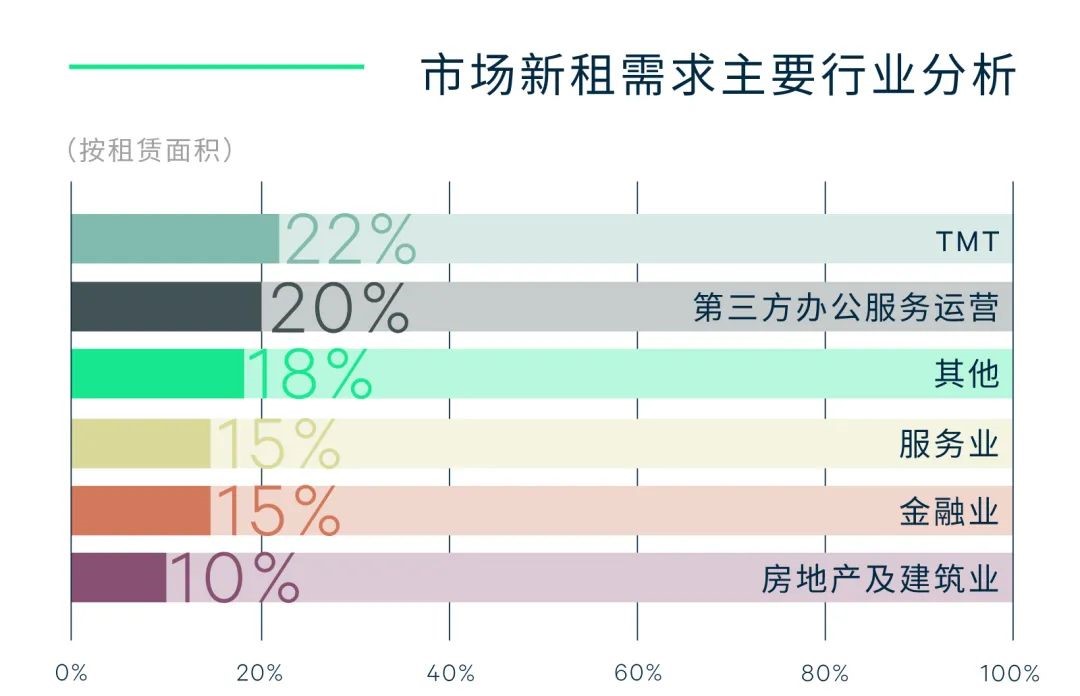 按租户行业看,TMT、第三方办公服务运营商及服务业为上半年需求前三大来源,分别占比22.3%、20.1%、15.2%。上半年,TMT仍为西安甲级写字楼市场主要新租需求来源。其中人工智能、芯片、云计算等细分行业需求进一步释放,推动行业需求持续增长。在二季度发布的《陕西省“十四五”数字经济发展规划》中将西安作为数字经济发展核心动力源,再次强调西安发展数字经济的核心地位,叠加《西安市“十四五”产业发展规划》中强调着力培育人工智能、增材制造、大数据等新兴产业,相关细分领域的需求也将在未来持续成为需求持续增长的动能。