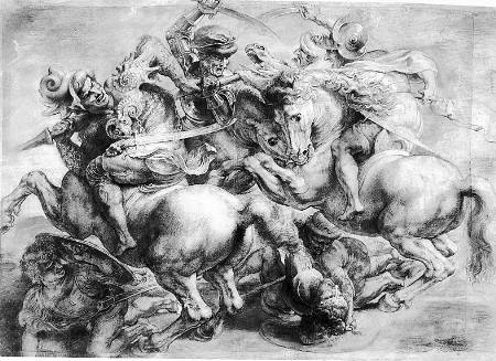 (上方)这张画是达·芬奇很有名的画,教你如何训练视觉观察方法?你盯着一个白墙,看一个月,直到你看到万马奔腾。这是他和米开朗基罗斗智斗勇的一张画。