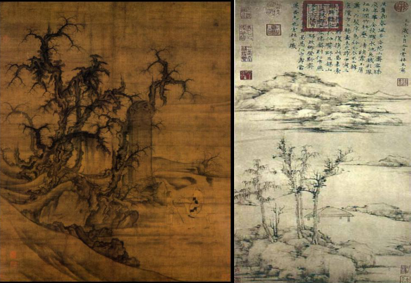 看作品是先看标题还是先看图片?这两张作品的标题我给删掉了。其实很多美术史系的学生,甚至是四十岁之前基本不会喜欢中国画,或者看不懂中国画。我不知道在座的各位谁能看出这两张画的妙处,一个是李成的《读碑窠石图》,一个是《容膝斋图》,可能对中国80%的观众来讲,这上面只是画了山和水就完了。绘画的妙处不在这里,它画了什么,是它通过这些绘画本身的达到的水平是什么。这一点特别重要。