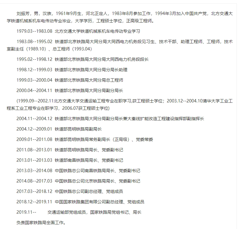 附新任国铁集团董事长刘振芳简历,来自交通部网站7月22日资料: