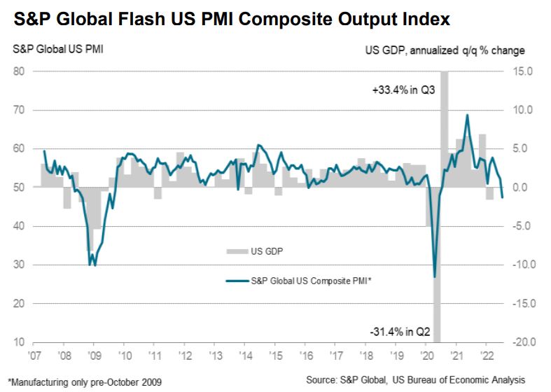 标普全球的报告显示,7月,美国综合PMI初值下滑4.8点至47.5,跌破50荣枯线,为2020年5月以来最低。指数高于50意味着行业处于扩张,低于50则意味着萎缩。