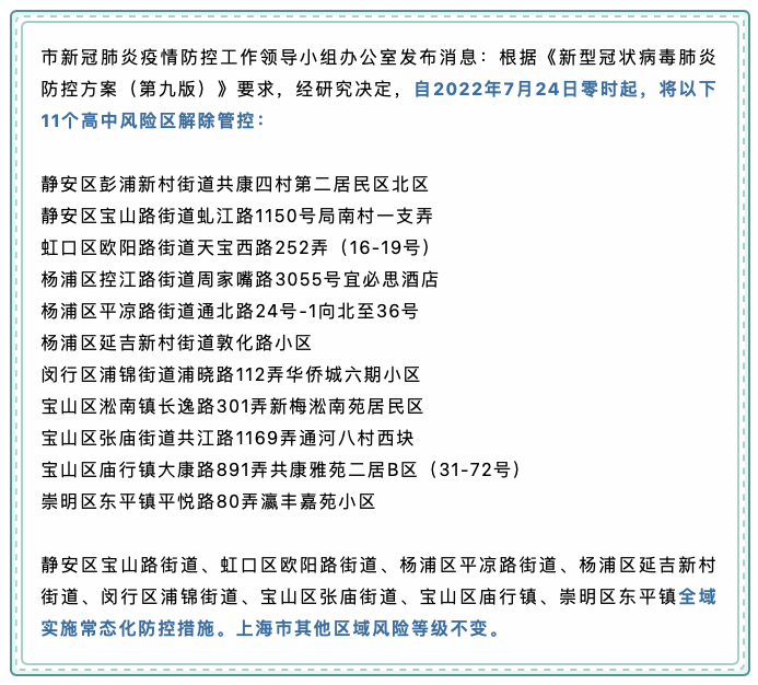 “上海发布”微信公众号7月23日消息,上海市新冠肺炎疫情防控工作领导小组办公室发布消息:根据《新型冠状病毒肺炎防控方案(第九版)》要求,经研究决定,自2022年7月24日零时起,将以下11个高中风险区解除管控:
